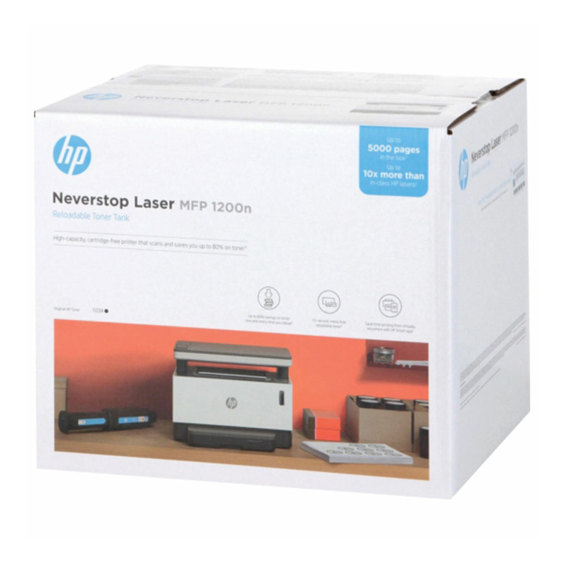 What’s in the box HP Neverstop Laser 1200n Printer; Preinstalled HP Black Original Imaging Drum (5,000 pages yield, 20,000 pages useful life); Reference guide; Setup guide; Regulatory flyer; Support flyer; Warranty guide; Power cord