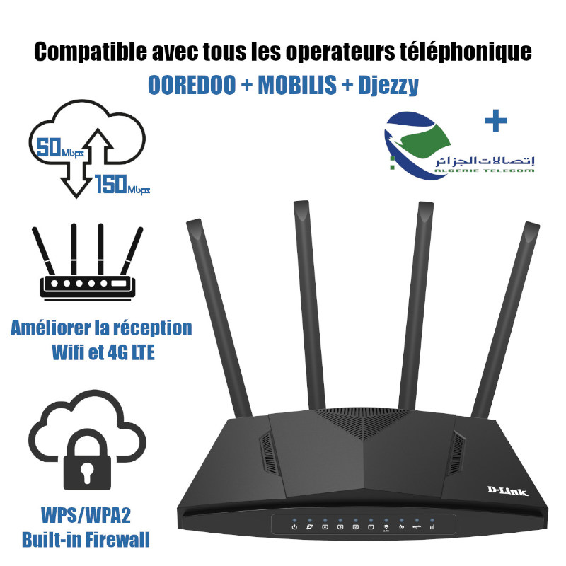 Routeur Modem 4G sans fil N300 LTE compatible avec tous les operateurs Algérie Télécom OOREDOO + MOBILIS + Djezzy, Sans Configuration , prét a l’emploi