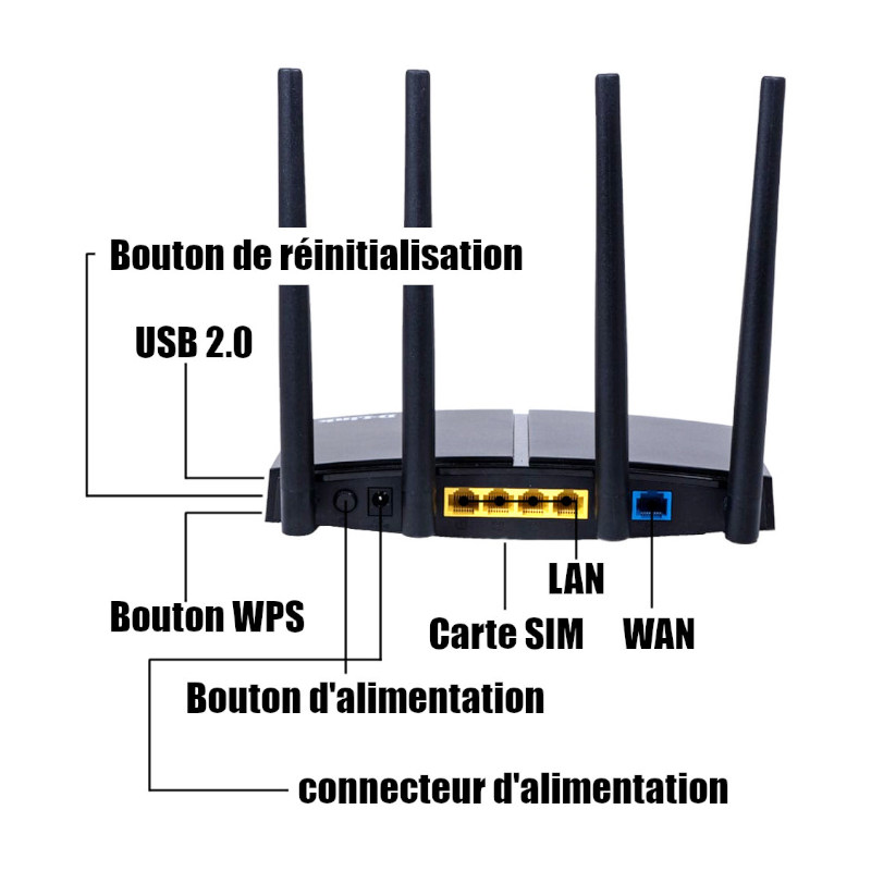 - Antenne: 2 x antenne Wi-Fi 5dBi + 2 x antenne 5dBi LTE15 pour la 4G