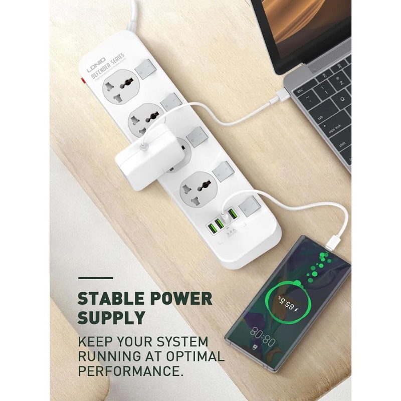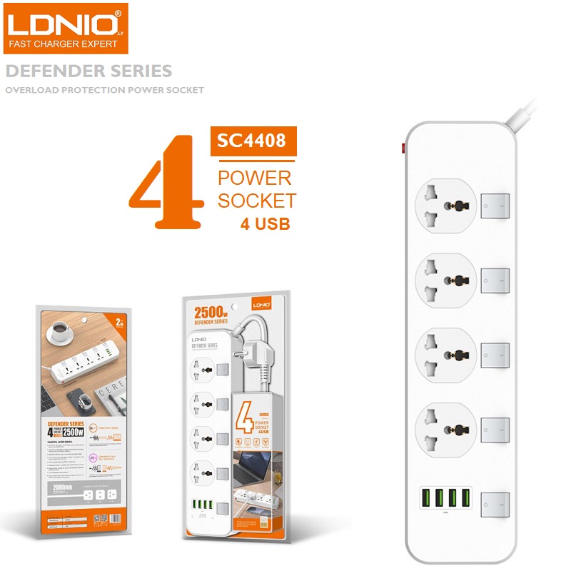 What’s in the Package: 1 x LDNIO SC4408 Power Strip Product Specifications and Features 4 Universal Outlet 4 USB Over Charge Protection 850°C Anti-Flaming Safety 4 Plug Bits Child Security Door Switch LED Indicator 2in1 4 Power Socket (2500w) *2M Heavy-Duty Power Cord *LED Incator and On/Off Switch *Protect Up to 4 Devices Against Spikes , Fluctuations and Electromagnetic Interference *Integrated Copper No Welding Spot and With Stable Current *The Integrated ABS Shell ,850°Anti-Flaming Package Dimension (cm):38x18x6 Package Weight (kg): 0.73