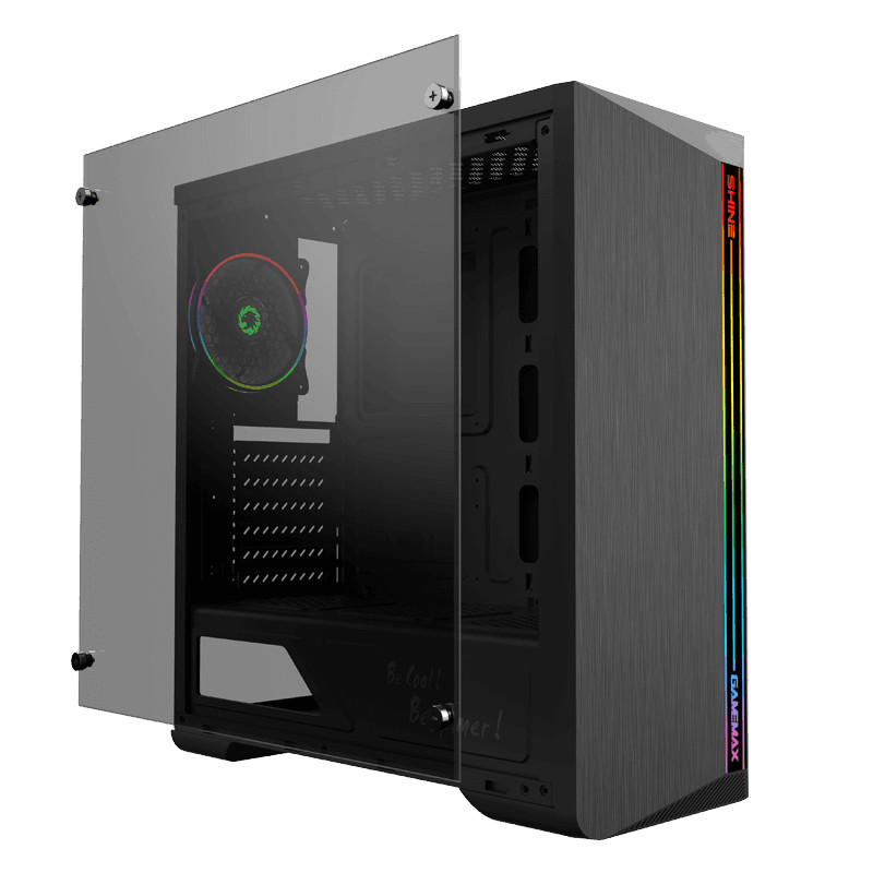 Le modèle GameMax Shine G517 apporte votre excellente bande lumineuse Rainbow sur le panneau avant qui peut être programmée par un contrôleur interne, inclus plus de 100 modes pour votre sélection, ainsi qu’un ventilateur adressable Rainbow de 12 cm fixé à l’arrière, optimisez le refroidissement à l’intérieur et obtenez la couleur SYNC changements correspondant aux bandes Rainbow avant
