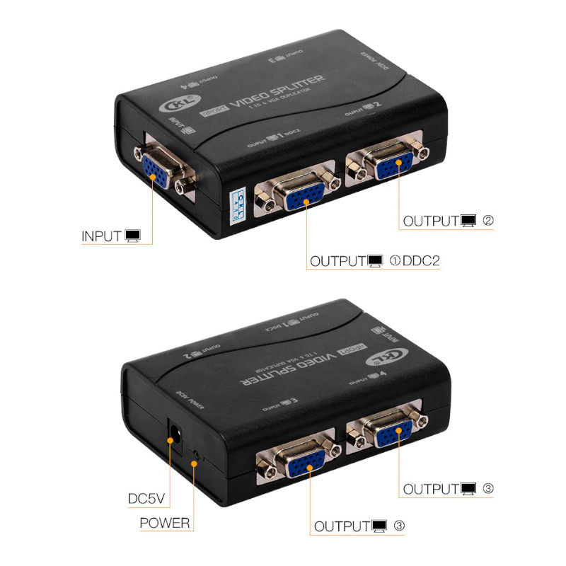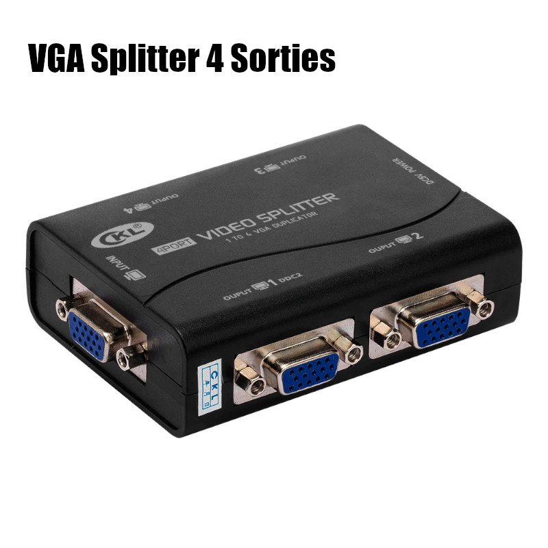 - 1 entrée VGA, 4 sorties VGA. Prend en charge une bande passante vidéo de 250 MHz.